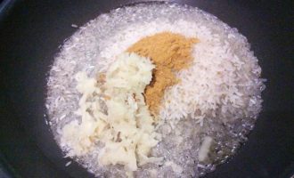 Для риса разогреть оливковое масло. Выложить в мясо натертый имбирь, карри, кардамон (предварительно раздробить коробочки кардамона и растереть семена в ступке) и рис. Размешать и прогреть, чтобы рис пропитался ароматами масла и специй.