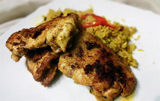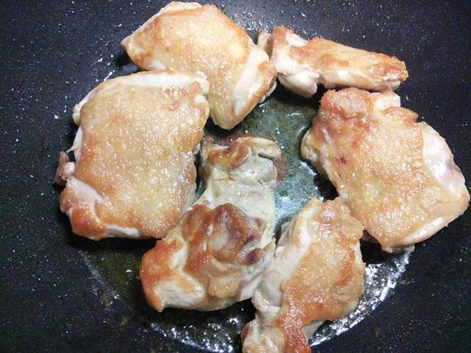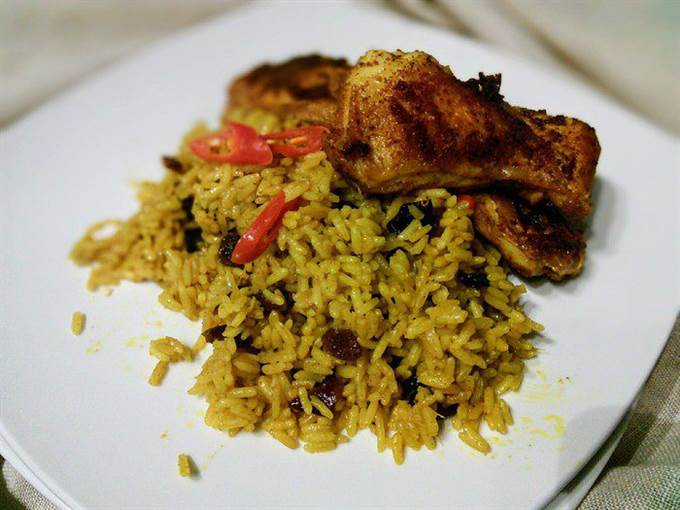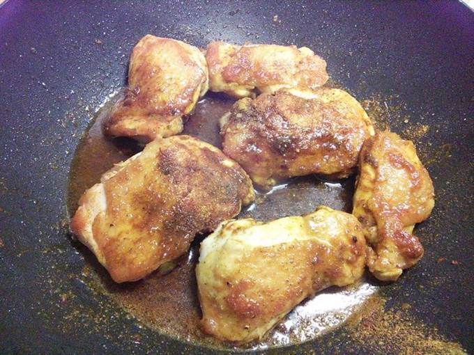 У меня были куриные бедра без костей, им хватило до готовности 20 минут. Когда мясо готово, увеличить огонь и обжарить кусочки курицы до хрустящей корочки. Мясо готово, рис тоже.