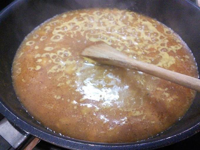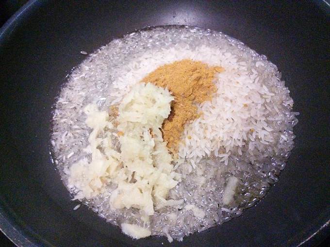 Для риса разогреть оливковое масло. Выложить в мясо натертый имбирь, карри, кардамон (предварительно раздробить коробочки кардамона и растереть семена в ступке) и рис. Размешать и прогреть, чтобы рис пропитался ароматами масла и специй.