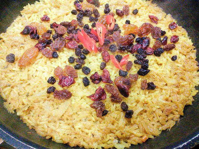За это время рис впитает жидкость. Добавить изюм и чили, заправить соком лайма и, если необходимо, посолить. Выключить огонь и дать рису настояться.