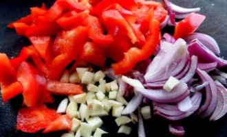• Перцы, лук крупно нарезать, чеснок порубить.
