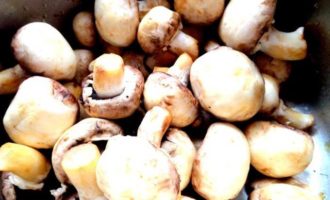 • Я делала половину от количества в рецепте. Итак шампиньоны промыть, отварить 5 минут в 1,5 л воды с добавлением 1 ст. ложки соли. Дать стечь через сито.