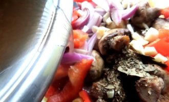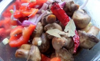 • На дно уложить зелень, сверху грибы и перцы. Я сложила в стеклянную миску для СВЧ, но лучше в широкую банку. На данном этапе добавить чеснок и чили.
