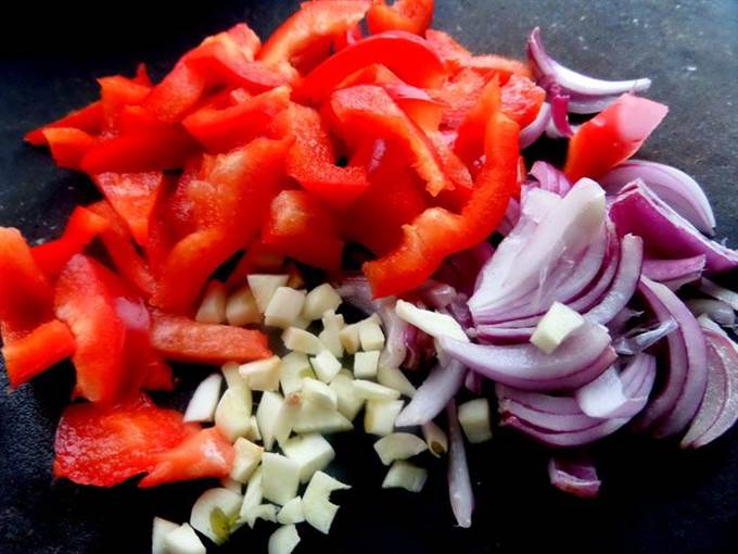 • Перцы, лук крупно нарезать, чеснок порубить.