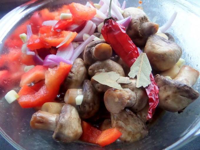 • Смешиваем маринад (кроме масла и уксуса), нагреваем и кипятим до растворения соли и сахара, выключаем огонь и добавим уксус и масло. Заливаем осторожно наши грибы!