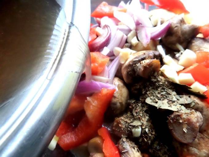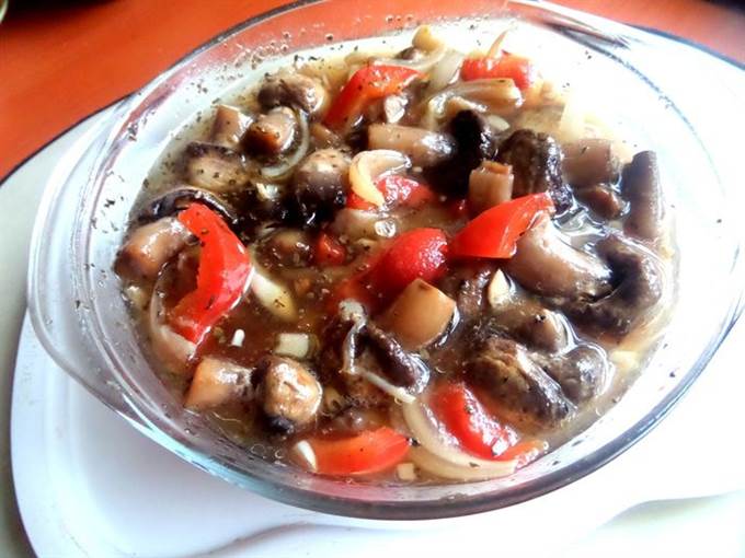 • На дно уложить зелень, сверху грибы и перцы. Я сложила в стеклянную миску для СВЧ, но лучше в широкую банку. На данном этапе добавить чеснок и чили.