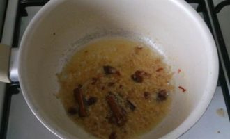 Разогреть сливочное масло и прогреть в нем корицу, тертый имбирь, бадьян и гвоздику 1 минуту постоянно помешивая. Добавить порезанный острый перец.