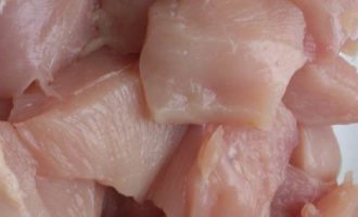 Грудку помыть, обсушить и нарезать небольшими кубиками.