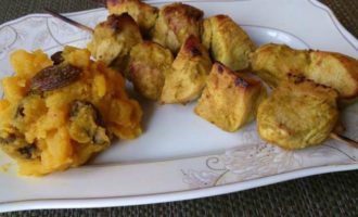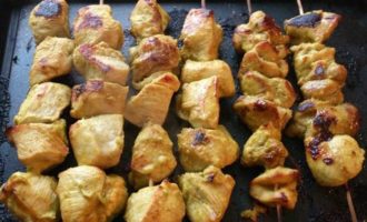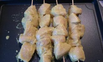 Деревянные шпажки замочить в холодной воде на 30 минут. Нанизать мясо мясо на шпажки, выложить на жаростойкое блюдо.