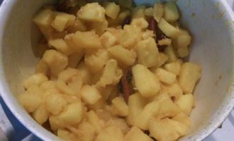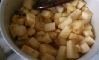 Добавить очищенные и порезанные на кубики яблоки и обжарить до румяности.