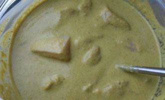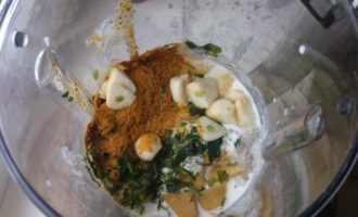 В блендер влить йогурт, добавить очищенное и измельченное манго, чеснок, кинзу, куркуму и соль. Все хорошо взбить до однородного состояния.