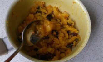 Влить воду, добавить изюм, куркуму и тушить под крышкой до мягкости. Немного остудить.