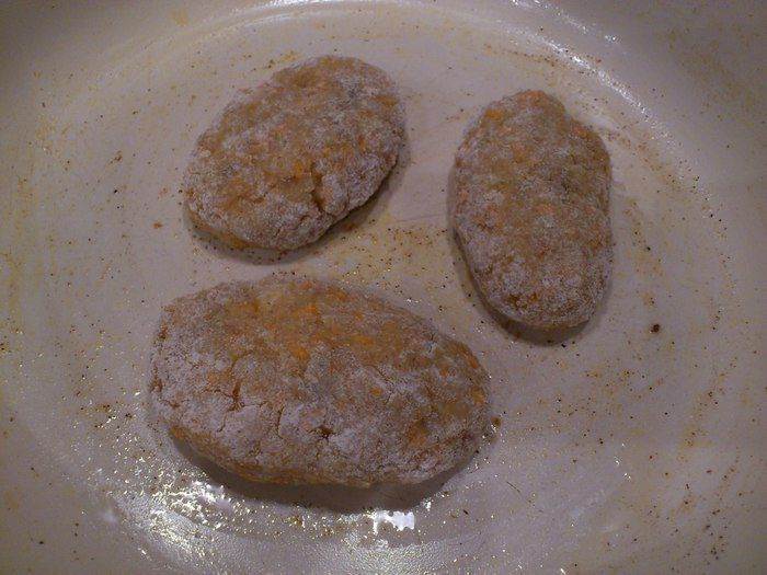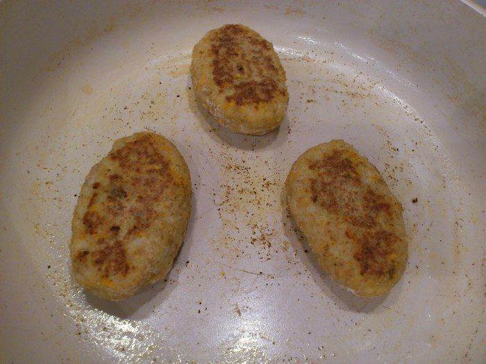 Формируем котлетки, выкладываем на разогретую сковороду, смазанную небольшим количеством масла.