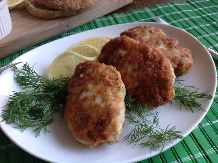 В рыбный фарш добавить яйца, лук обжаренный, хлеб размякший, укроп мелко порезанный, соль, перец. Хорошо вымесить и сфомировать котлеты, обвалять их в муке.