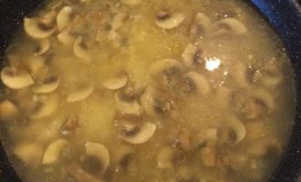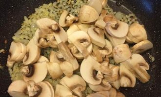 Лук потушить до золотистого цвета, добавить грибы, соль, перец и тушить 5 минут.