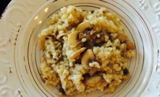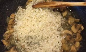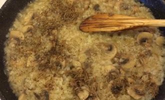 Рис хорошо промыть, добавить к грибам. Добавить соль, перец, перемешать и тушить 2 — 3 минутки.