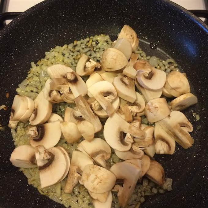 Лук потушить до золотистого цвета, добавить грибы, соль, перец и тушить 5 минут.
