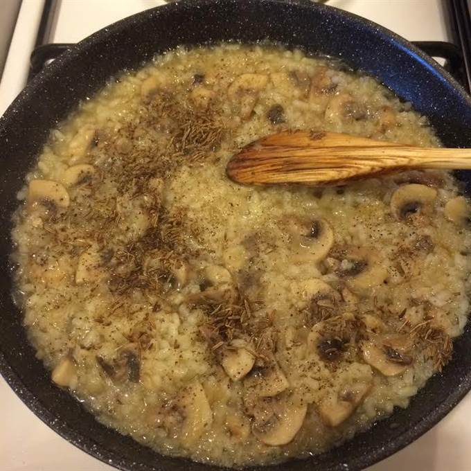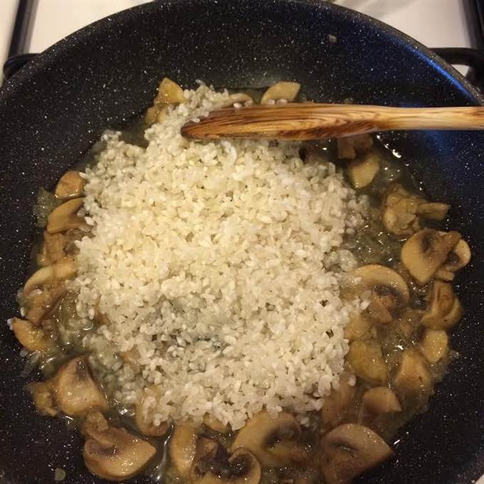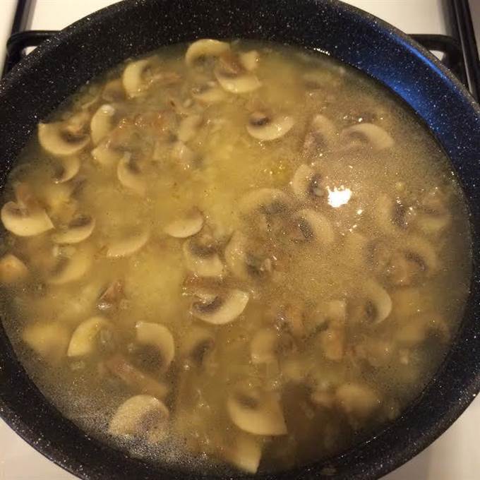Рис хорошо промыть, добавить к грибам. Добавить соль, перец, перемешать и тушить 2 — 3 минутки.