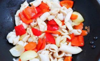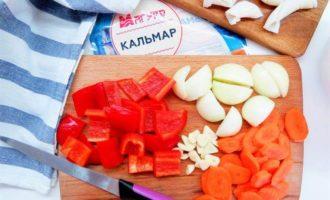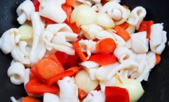 Добавляем к овощам наши кальмаровые шишки, обжариваем 2-3 минуты.