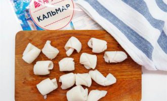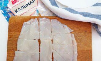 Нарезаем подготовленного кальмара на прямоугольники, размер примерно 2х4 см.