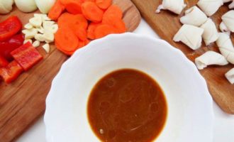 Делаем соус. В миске смешиваем соевый соус, рисовый уксус, херес (в идеале лучше использовать шаосинское кулинарное вино, но если его нет, то можно заменить хересом или просто десертным вином). Затем добавляем сахар и крахмал, перемешиваем до однородности.