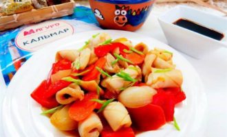 Заливаем подготовленной заправкой наши кальмары и овощи, быстро перемешиваем, отключаем огонь и даем настоятся кальмарам 3-5 минут. Соус должен быстро загустеть.