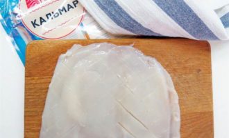 Сделать глубокие косые надрезы в виде сетки, не прорезая кальмар до конца. -