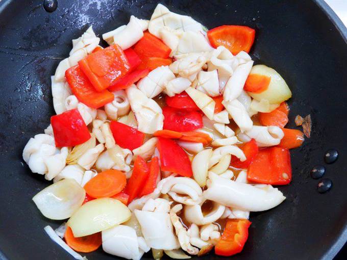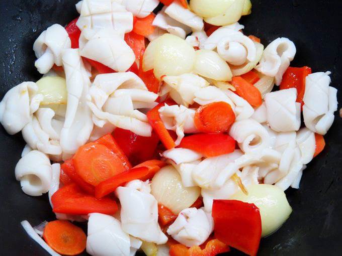 Добавляем к овощам наши кальмаровые шишки, обжариваем 2-3 минуты.