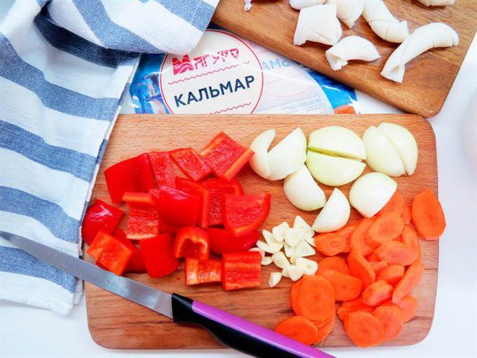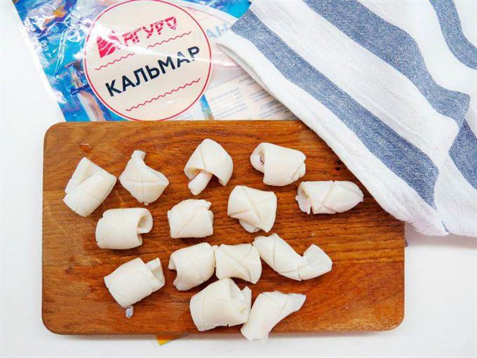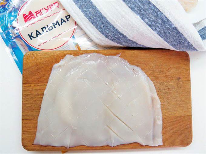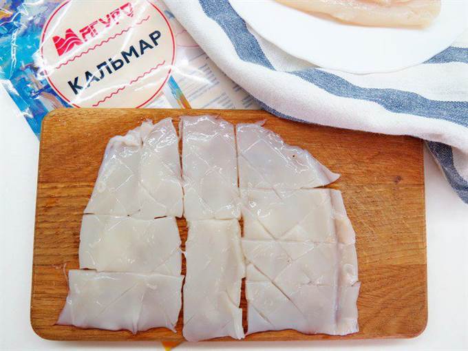 Сделать глубокие косые надрезы в виде сетки, не прорезая кальмар до конца. -