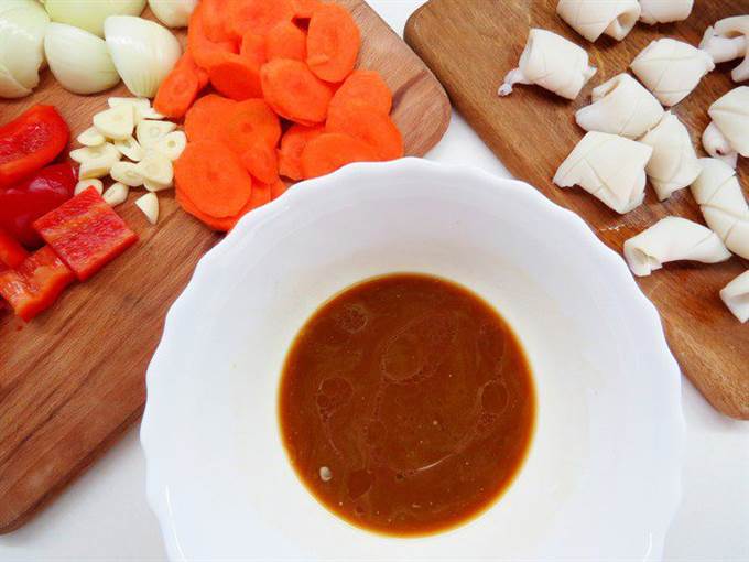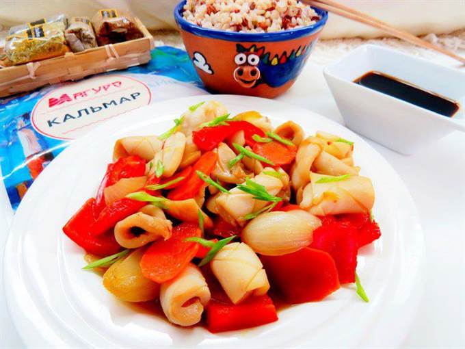 Заливаем подготовленной заправкой наши кальмары и овощи, быстро перемешиваем, отключаем огонь и даем настоятся кальмарам 3-5 минут. Соус должен быстро загустеть.