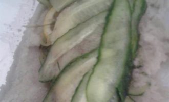 В соль вылить три ложки воды, соль должна быть как кашица. У меня сибас был маленький — 350 г, я побоялась такого количества соли, и поэтому обернула его тонким слоем огурца. Соли было достаточно. Может эта процедура была лишней, но результатом я была довольна.