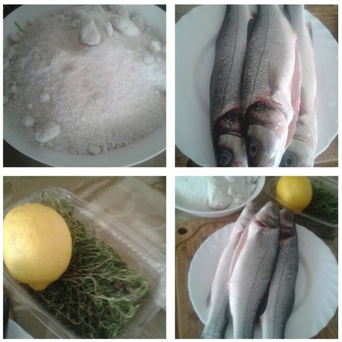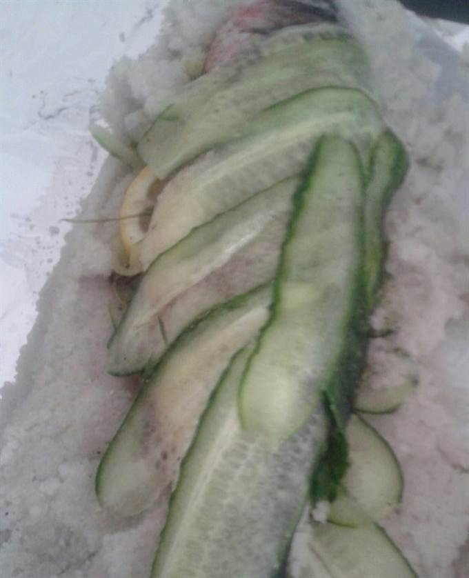 В соль вылить три ложки воды, соль должна быть как кашица. У меня сибас был маленький — 350 г, я побоялась такого количества соли, и поэтому обернула его тонким слоем огурца. Соли было достаточно. Может эта процедура была лишней, но результатом я была довольна.