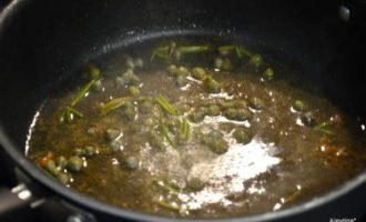 На сковороду выложим каперсы, шалфей и розмарин. Обжариваем 30 секунд, добавим 1/2 стак. вино, 1 стол.л слив.масло. Тушим несколько минут, до тех пор пока жидкость не убавится.