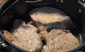 Разогреть 1 стол.л олив.масла на сковороде. Добавить 1 стол.л слив.масла. Обжарить свинину с 2х сторон. Снять с огня добавить вторую партию также олив.масло и слив.масло, а затем свинину и обжариваем до готовности. Переложим на тарелку. Прикрыть фольгой.
