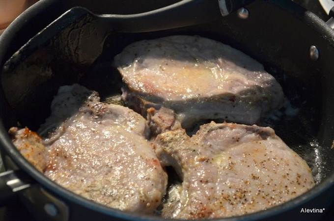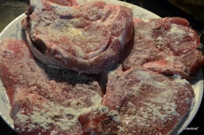 Свинину порезать на кусочки, если филе. Или используем свиные котлеты на косточке или в тонкой нарезке.