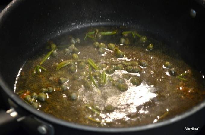 На сковороду выложим каперсы, шалфей и розмарин. Обжариваем 30 секунд, добавим 1/2 стак. вино, 1 стол.л слив.масло. Тушим несколько минут, до тех пор пока жидкость не убавится.