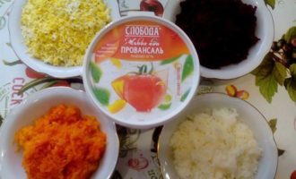 • Яйца, свеклу, морковь, картофель натереть на средней терке. Лук нарезать кубиками.