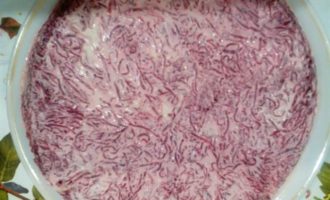 • 5 слой: свекла, промазать майонезом. Украсить верх салата по своему вкусу. Накрыть пищевой пленкой. Дать пропитаться в холодильнике 2 часа.