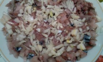 • Соленую скумбрию почистить от шкурки и костей. Нарезать кубиками.