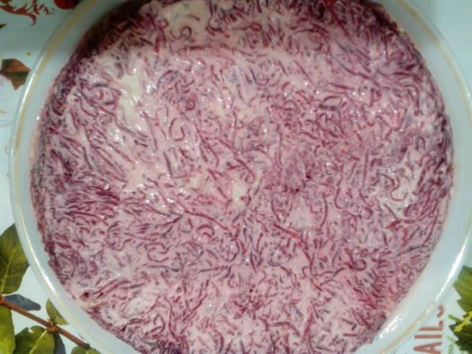 • 5 слой: свекла, промазать майонезом. Украсить верх салата по своему вкусу. Накрыть пищевой пленкой. Дать пропитаться в холодильнике 2 часа.