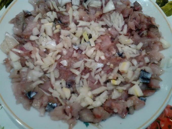 • Соленую скумбрию почистить от шкурки и костей. Нарезать кубиками.