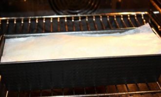 Достаем из духовки. Не раскрывая бумагу, кладем сверху пресс. Ставим в холод до полного остывания.