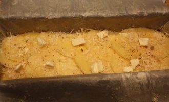 Форму выкладываем бумагой для выпекания, промазанной сливочным маслом. Затем выкладываем картофель внахлест. Каждый слой посыпаем приправой для картофеля и тертым сыром и кладем кусочки сливочного масла. Солить через слой. Когда доходим до среднего слоя, выдавливаем чеснок через чеснокодавку, затем сыр и масло. Когда все слои выложены, залить 100 мл сливок.