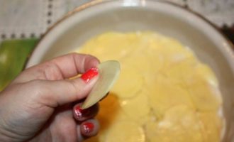Картофель почистить и нарезать на тонкие кружочки. Нарезая картофель, сразу опускаем его с миску со сливками.