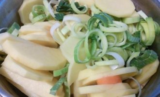 Пока расстаивается хлеб займемся овощами: порей помыть, нарезать на кружочки. Так же поступить с морковкой. И очистить и нарезать тонкими кольцами. Картошку очистить и так же нарезать тонкими слайсами. Перемешать в миске овощи между собой. -