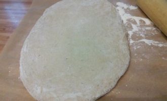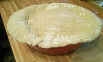 Маринад процедить, не выливать. Тесто раскатать на посыпанном мукой листе пергамента в размер формы, в которой вы будете готовить мясо (форма для духовки). Пласт теста должен быть на 2-3 см больше самой формы и в 1 см толщиной.