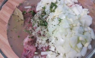 Мясо необходимо замариновать на ночь. Для этого его нужно помыть, обсушить, избавить от жилок и плёнок, нарезать на порционные кусочки. Мелко нарезать лук и чеснок, листики тимьяна отделить от веточек. Мясо соединить со всеми ингредиентами маринада, залить вином, поперчить, хорошенечко перемешать, накрыть ёмкость и оставить мясо мариноваться минимум на 12 часов. От себя я добавила щепотку свежего розмарина и шалфея.