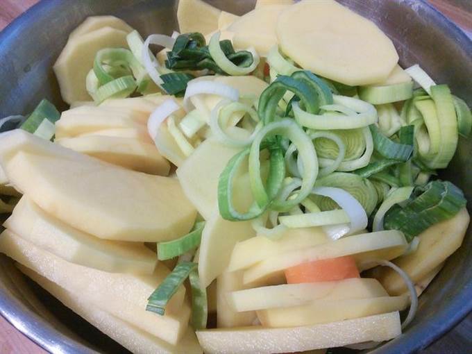 Пока расстаивается хлеб займемся овощами: порей помыть, нарезать на кружочки. Так же поступить с морковкой. И очистить и нарезать тонкими кольцами. Картошку очистить и так же нарезать тонкими слайсами. Перемешать в миске овощи между собой. -