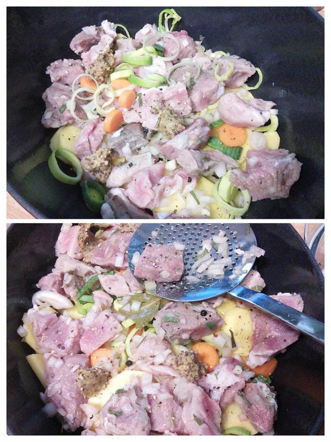 Выкладываем слоями овощи, чередуя их мясом, не забываем солить и перчить слои. Каждый свой смазываем горчицей. Заливаем маринадом.