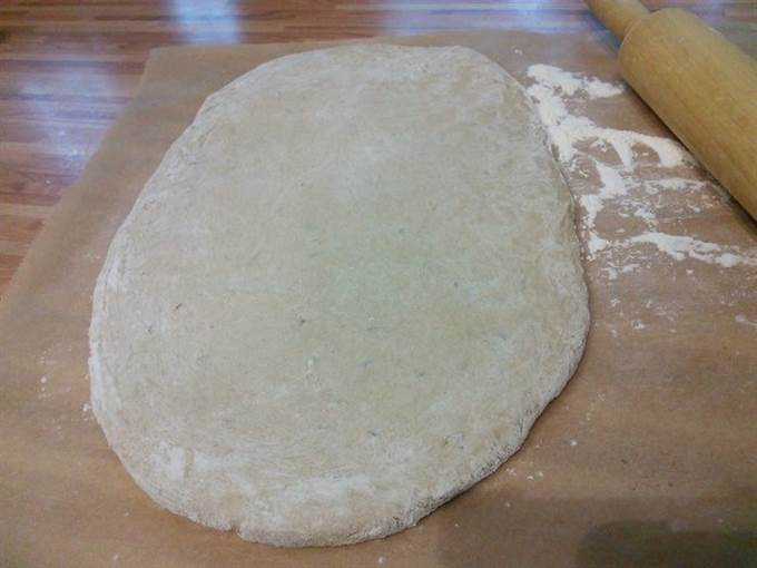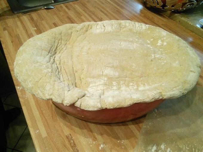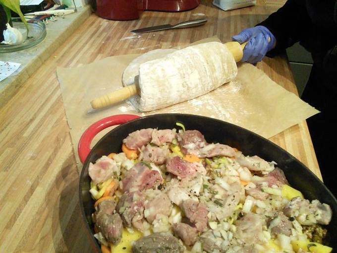 Маринад процедить, не выливать. Тесто раскатать на посыпанном мукой листе пергамента в размер формы, в которой вы будете готовить мясо (форма для духовки). Пласт теста должен быть на 2-3 см больше самой формы и в 1 см толщиной.
